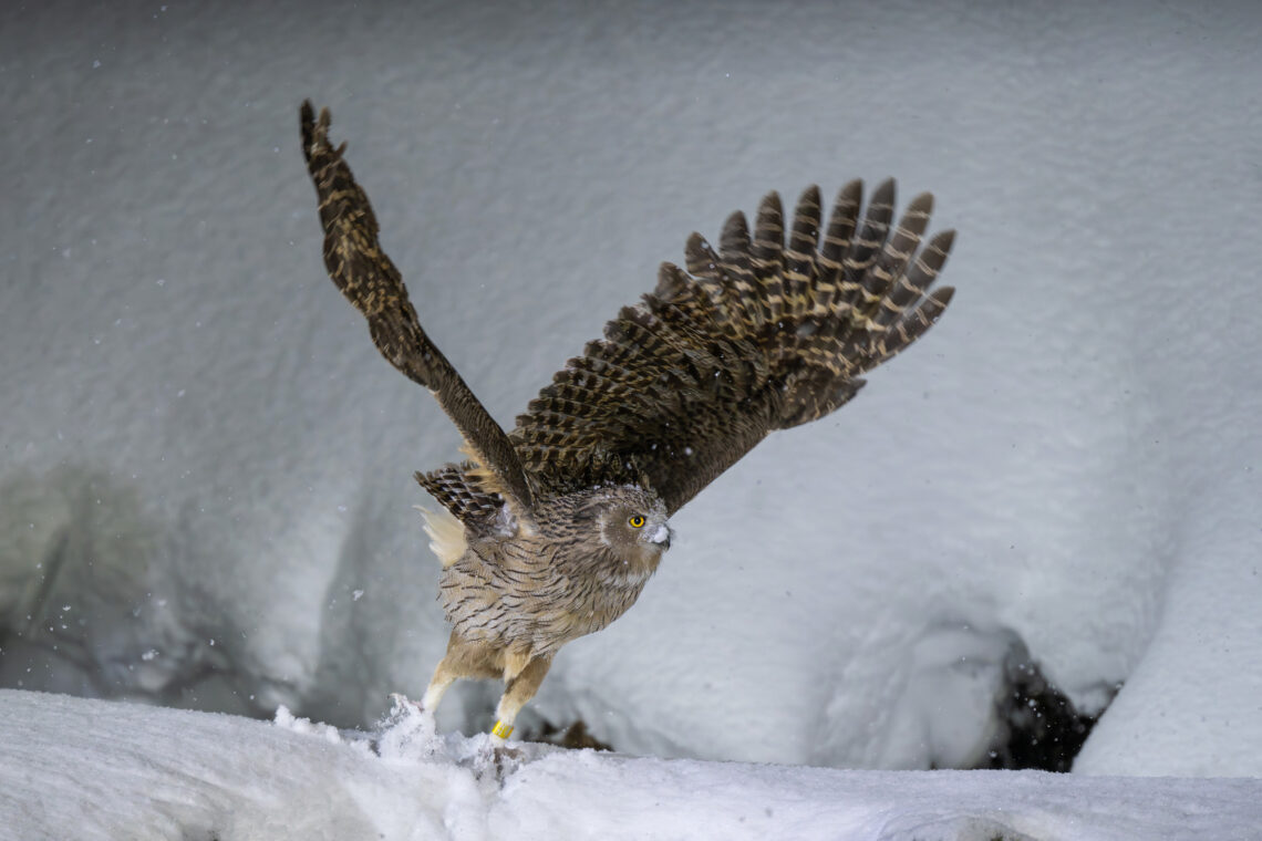 Mit einer Flügelspannweite von etwa 180 cm ist er die grösste Eulenart. Mit nur etwa 140 Vögeln, die auf Hokkaido leben, ist er auch einer der am stärksten gefährdeten Vögel. In Rausu werden Fische in einem felsigen Bereich des Flusses ausgesetzt, und angezogen von den Fischen kann man die Blakiston-Fischuhu vom Beobachtungsbereich aus sehen. Die Beleuchtung ist speziell für Fotoaufnahmen ausgelegt, sodass Sie auch nachts ohne Blitz fotografieren können.